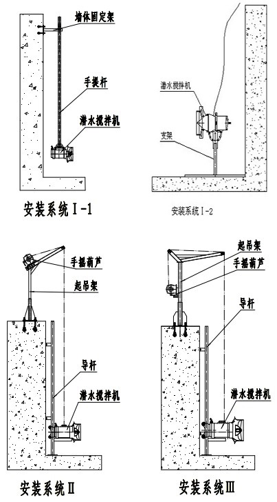 當池深H<4米時建議采用安裝系統一。潛水攪拌機的潛水深度可以根據需要進行垂直方向的調節,而且在水平賣弄內可繞導桿旋轉的最大角度為正負60°起吊系統底座、支撐架和下托架與池的有關連接面均采用膨脹螺栓固定,無需預留孔。安裝系統二用導向鋼繩替代導桿,具有運輸方便,現場安裝簡單等特點。該系統從根本避免了由于運輸引起導桿彎曲的、變形從而影響正常使用的情況,并有效改善了池深過深情況下,由于導桿的安裝誤差而導致的無法正常起吊等現象。在有懸臂池頂的安裝條件下更顯得操作方便可靠。